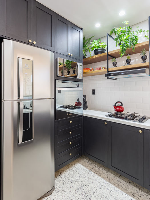 Este ambiente moderno e criativo destaca-se pela integração de elementos de design contemporâneo e funcionalidade. A marcenaria planejada inclui painéis de madeira ripada nas paredes, que além de conferirem textura, proporcionam um toque de aconchego. A bancada em preto fosco se estende ao longo da parede, servindo como suporte para eletrônicos e decoração. A iluminação embutida no teto, com linhas retas, cria uma atmosfera dinâmica e bem iluminada. O sofá de couro claro oferece conforto, complementando a paleta neutra e destacando o contraste com as paredes escuras. Elementos decorativos como o quadro pop art e a releitura da Mona Lisa trazem personalidade e estilo ao espaço.