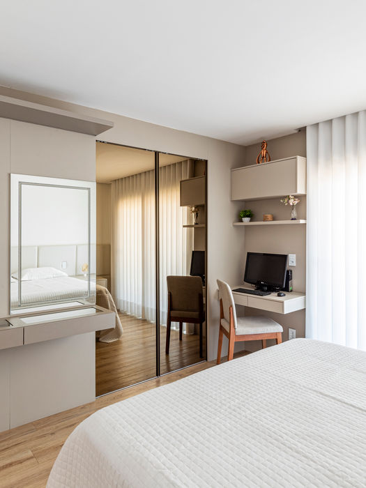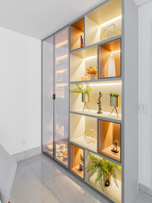 A imagem exibe uma área integrada de sala de jantar e cozinha com móveis planejados modernos. À direita, há uma estante planejada com nichos abertos e fechados em tons de cinza e madeira, decorada com itens decorativos e livros. O ambiente é iluminado por uma luminária pendente sofisticada com detalhes em vidro e metais brilhantes. Na cozinha, os armários planejados possuem um design minimalista, também em tons de cinza, com puxadores embutidos para um visual clean. A bancada de granito preto divide a cozinha da sala de jantar, apresentando uma pequena prateleira suspensa para taças. O conjunto de cadeiras e mesa preta na sala de jantar complementa o estilo moderno e funcional dos móveis planejados.