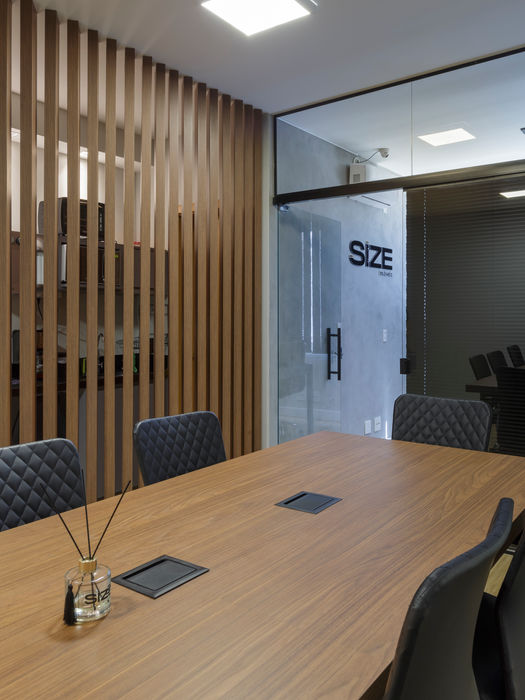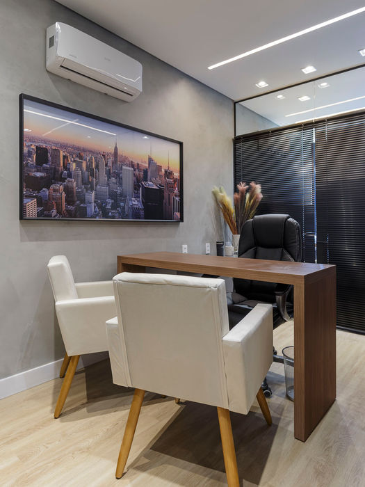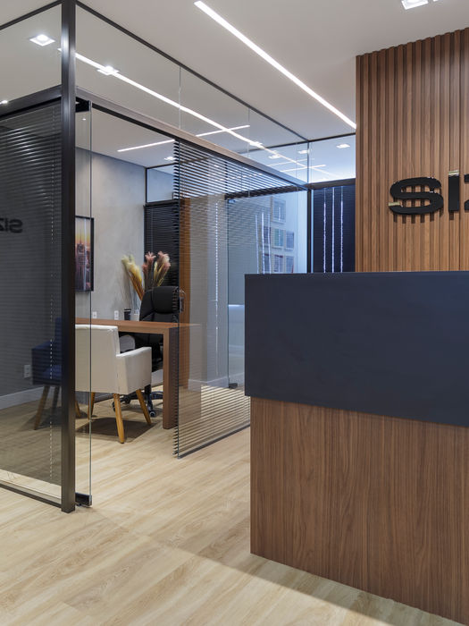 A imagem apresenta uma cozinha planejada com móveis modernos e funcionais. Os armários superiores são de cor cinza fosco, proporcionando um visual contemporâneo, e se estendem até o teto, otimizando o espaço de armazenamento. A bancada em L é revestida com mármore preto de veios brancos, combinando com o rodapé e o frontão alto que protege a parede. A área de pia possui duas cubas de aço inoxidável com torneiras cromadas de design moderno. Há um nicho em madeira natural, destacando-se na parede, que acomoda um micro-ondas e itens decorativos. A coluna lateral também é revestida em mármore preto, e inclui prateleiras abertas que abrigam uma planta decorativa, trazendo um toque de natureza ao ambiente.